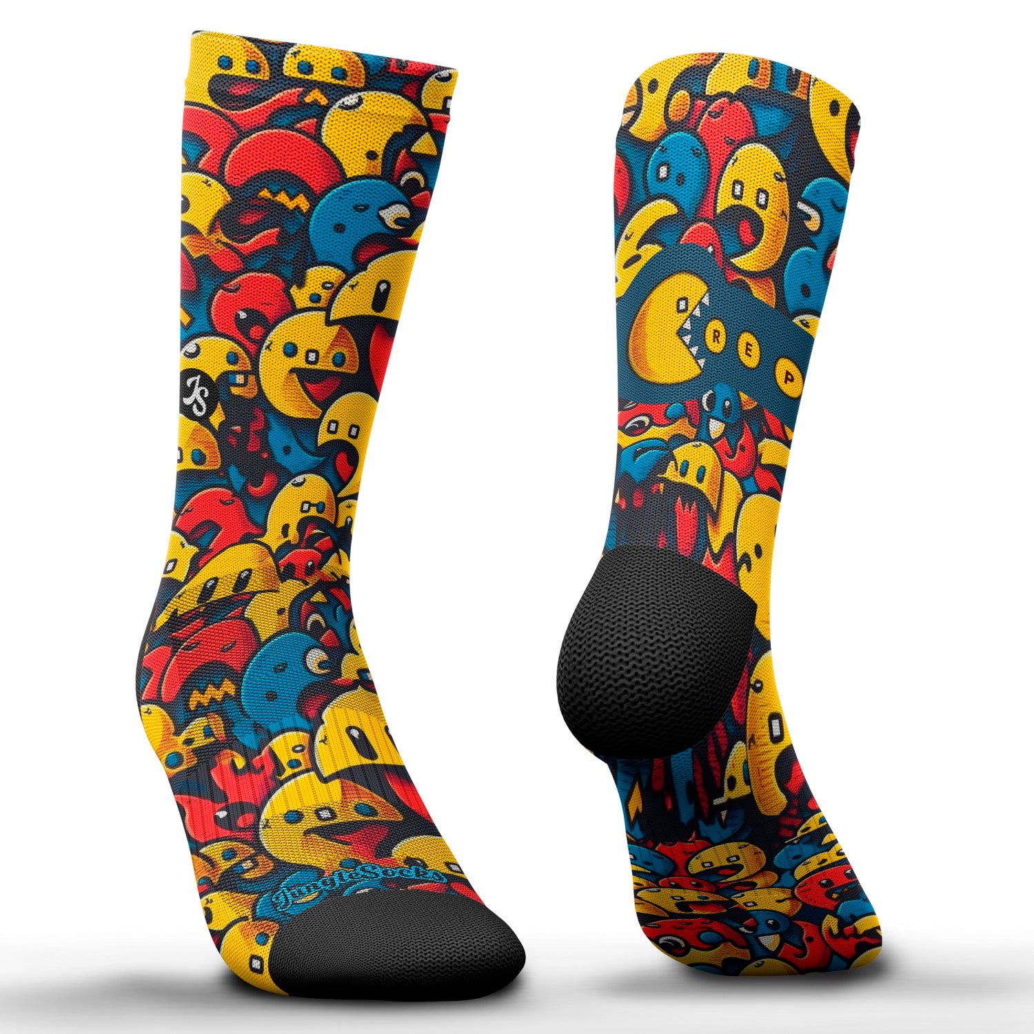 Wakka-wakka for the box: these technical socks are your power-up to devour reps like Pacman ghosts. Retro performance level, with modern technology to keep your feet dry while you play to eat reps at the box (now! when the coach isn't looking).